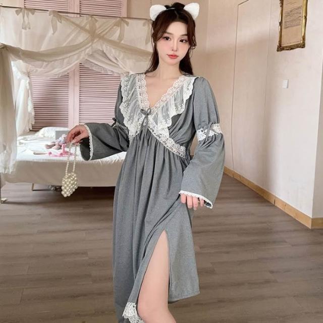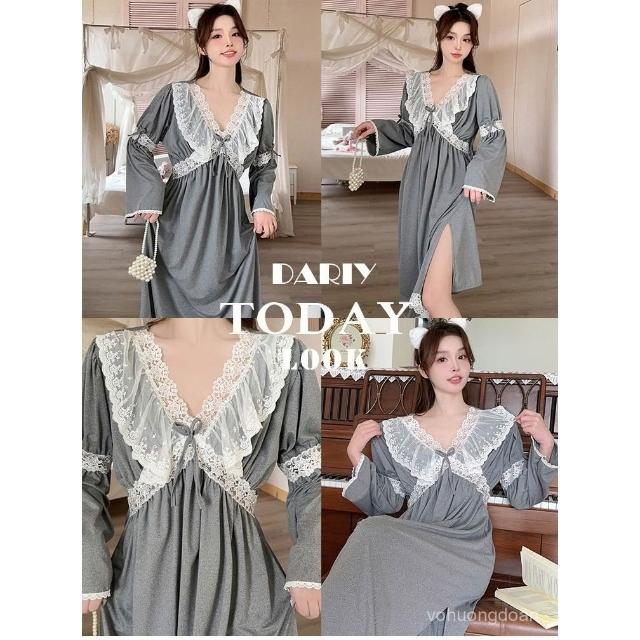 YMX—韓國春秋長袖蕾絲花邊少女棉睡裙長款法式宮廷泡泡袖睡衣女
