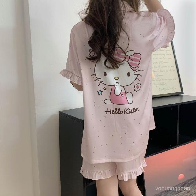 YMX—夏季短袖短褲冰雪絲睡衣女可愛卡通KT貓花邊印花開衫套裝女