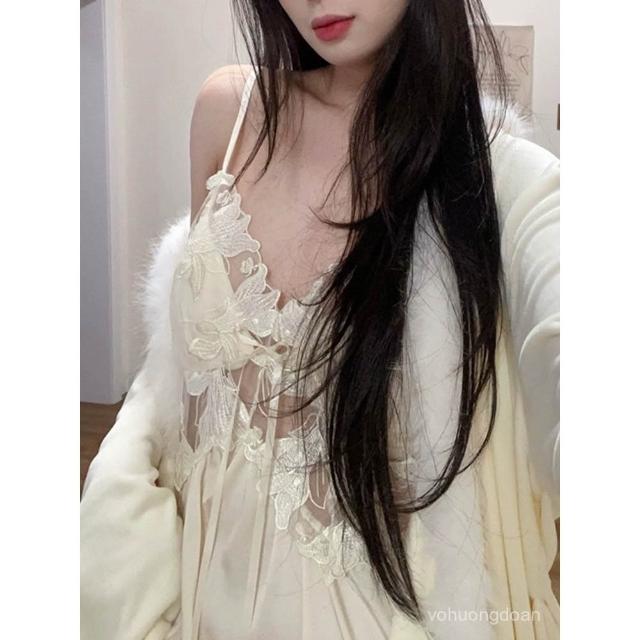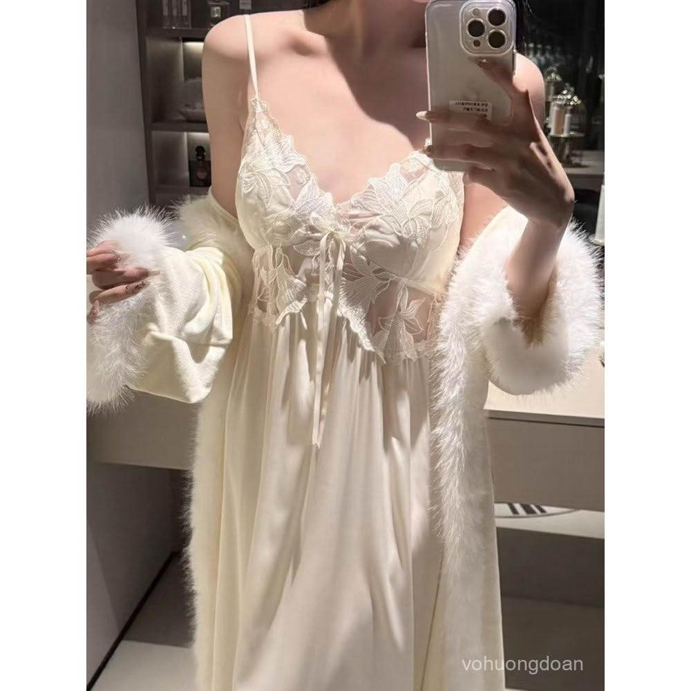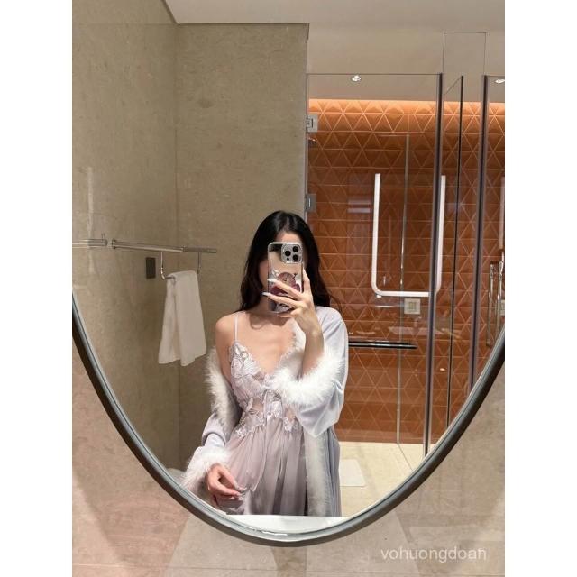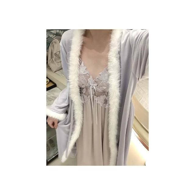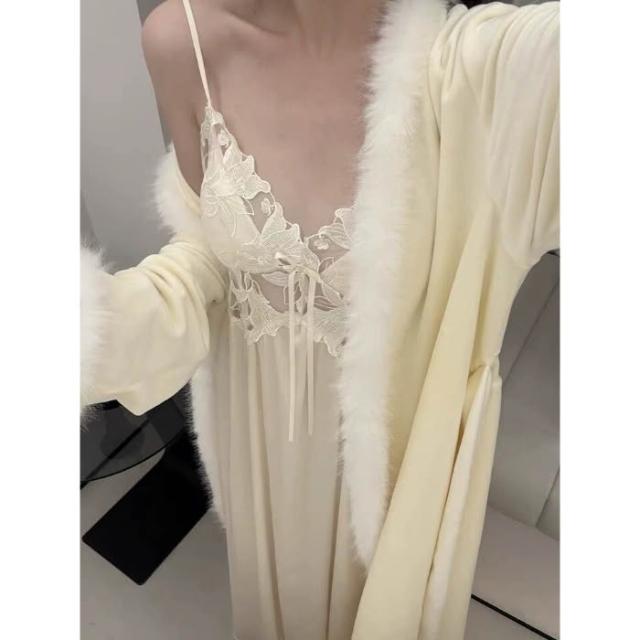 YMX—網紅爆款帶胸墊冰雪絲睡裙+海島絨睡袍奢華性感毛茸茸睡衣女