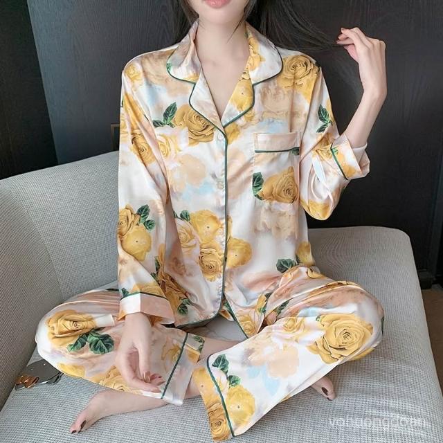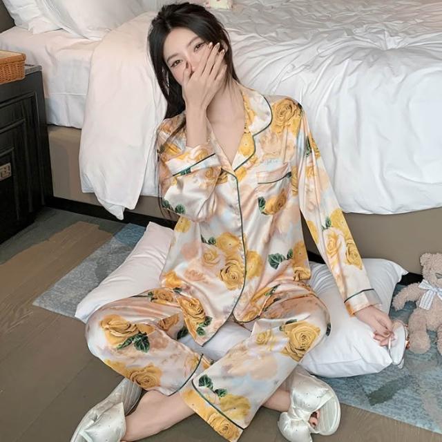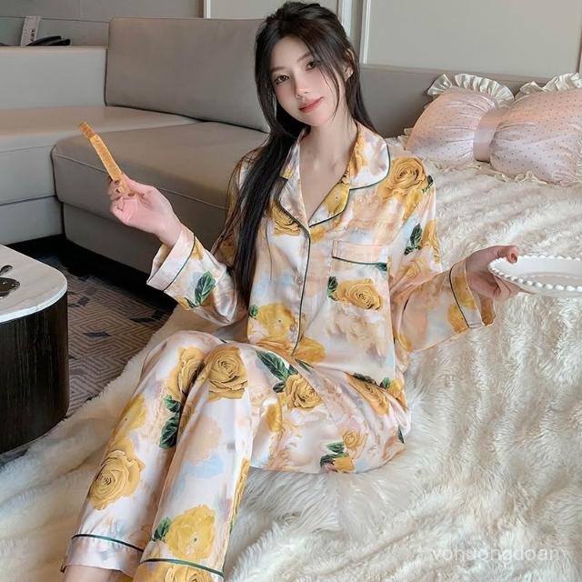 YMX—春秋長袖冰雪絲睡衣女高級感成熟女人花卉印花開衫外穿套裝