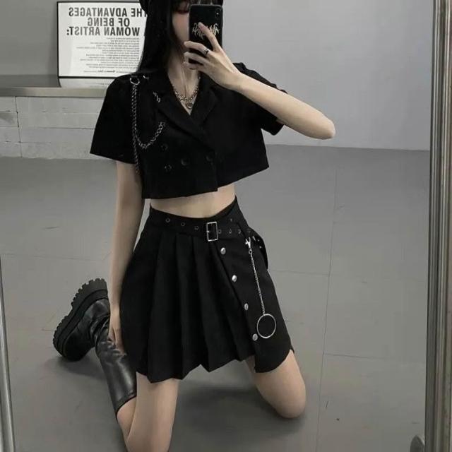 法式黑色時尚別緻短款西裝外套女夏ins甜辣妹百褶半身短裙兩件套