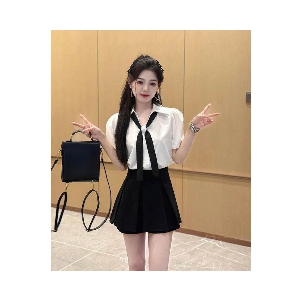 韓版寬鬆洋氣百搭短袖V領泡泡袖配領帶白色襯衫半身裙兩件套裝女