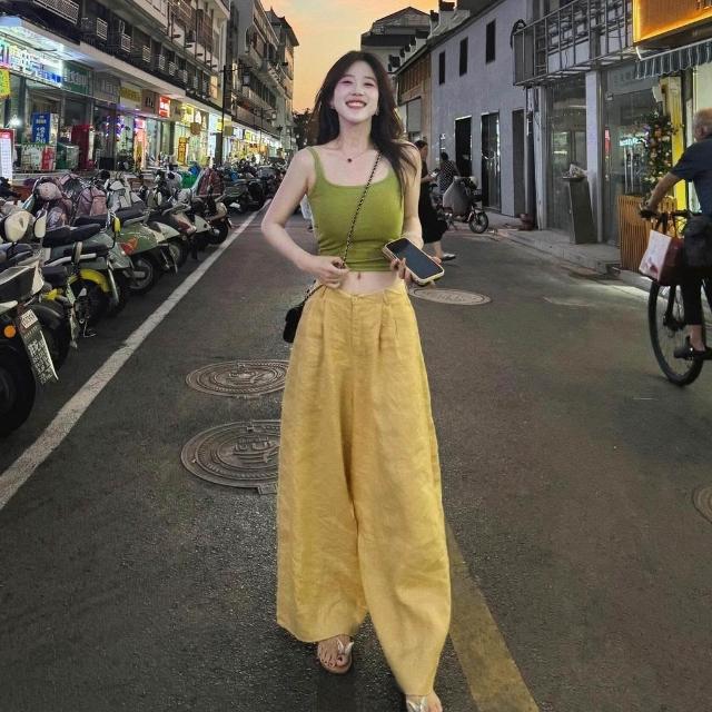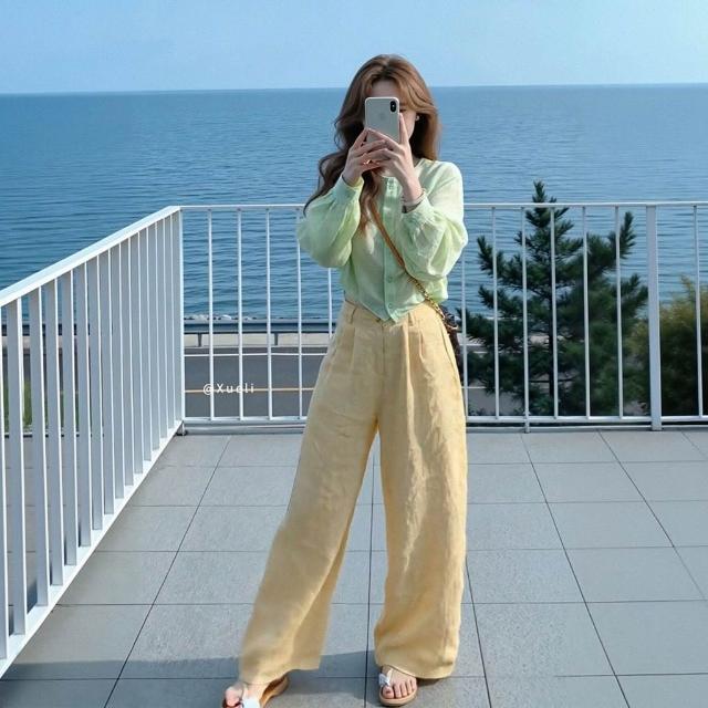 2026夏季超火減齡穿搭氣質一整套韓系綠色襯衫黃色闊腿褲兩件套女