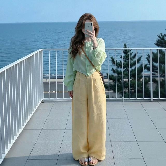 2026夏季超火減齡穿搭氣質一整套韓系綠色襯衫黃色闊腿褲兩件套女