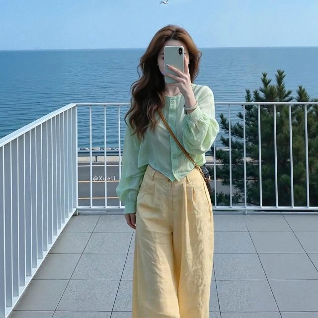 2026夏季超火減齡穿搭氣質一整套韓系綠色襯衫黃色闊腿褲兩件套女