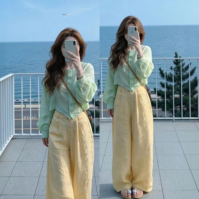 2026夏季超火減齡穿搭氣質一整套韓系綠色襯衫黃色闊腿褲兩件套女
