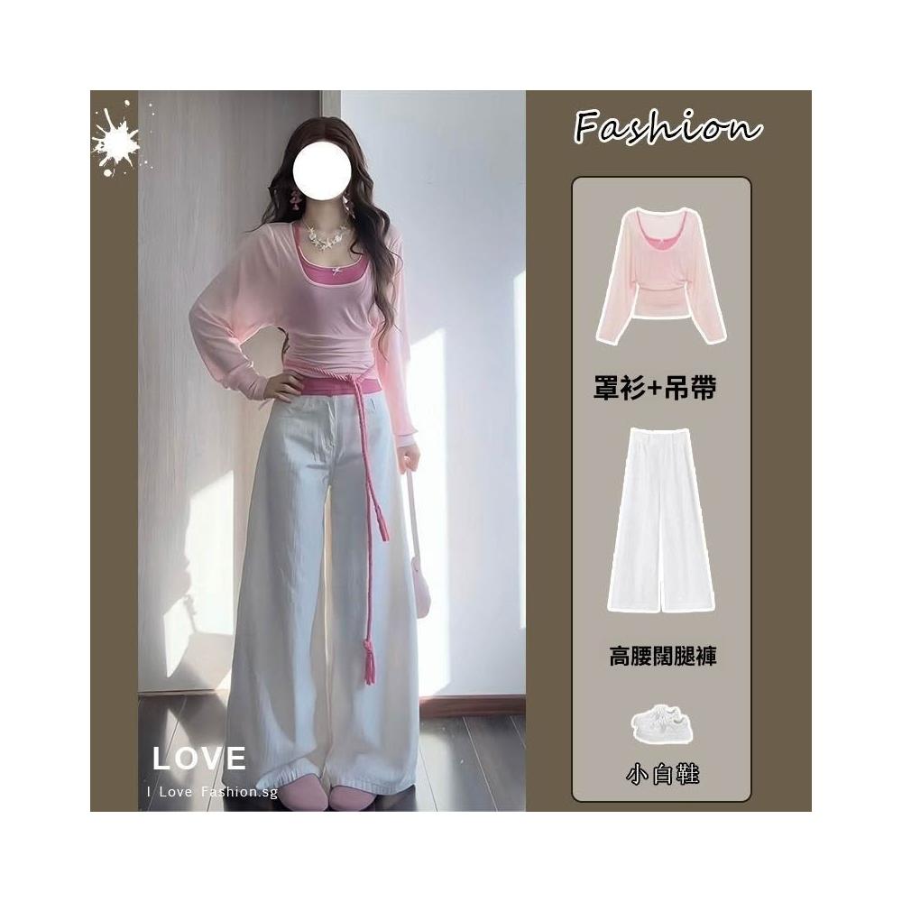 三件套女2026春季新款韓系高級感收腰防曬罩衫吊帶背心高腰闊腿褲