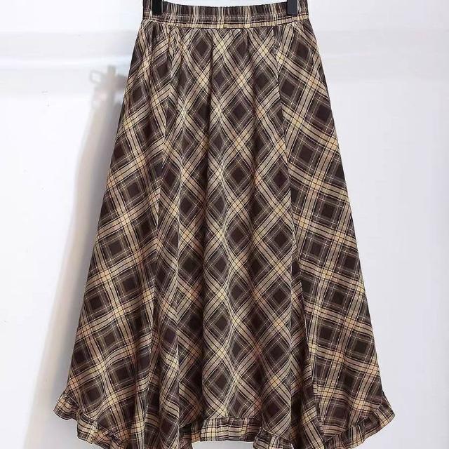 不規則斜肩長袖上衣雪紡格紋半身裙女套裝薄款2026早秋新款連衣裙