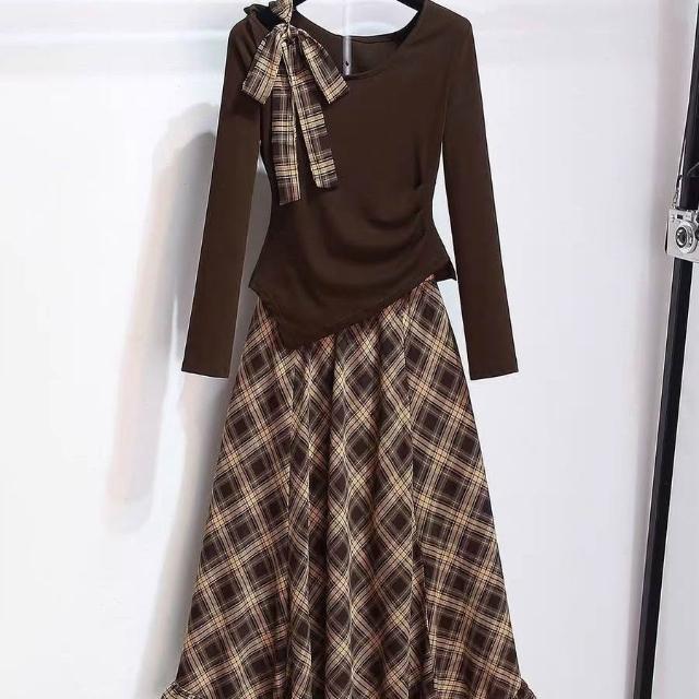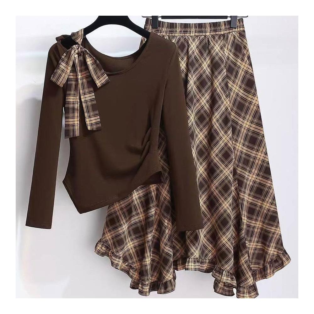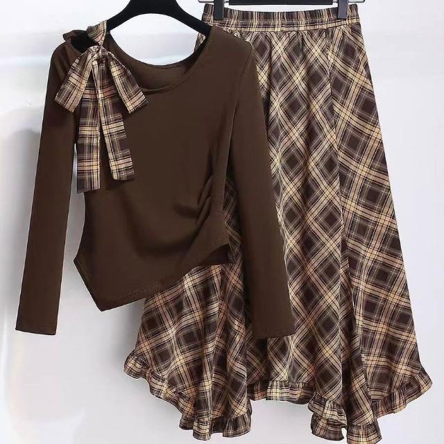 不規則斜肩長袖上衣雪紡格紋半身裙女套裝薄款2026早秋新款連衣裙