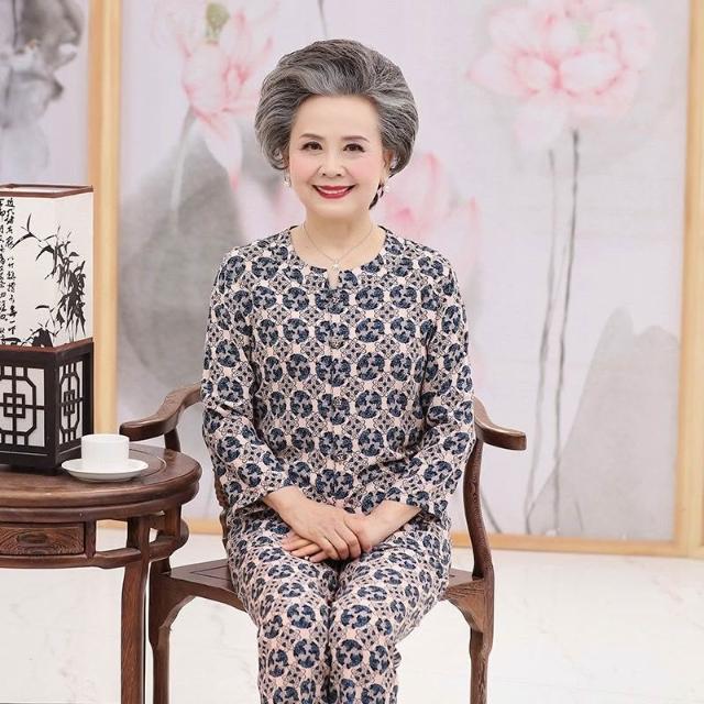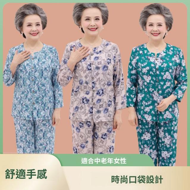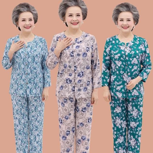 中老年睡衣女棉綢長袖老人媽媽奶奶家居服夏季人造棉套裝春秋季