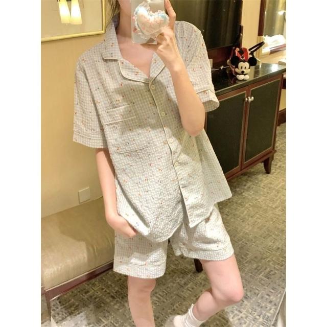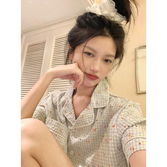 韓版ins碎花格子睡衣女夏季簡約短袖短褲網紅學生寬鬆家居服套裝
