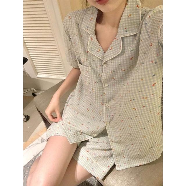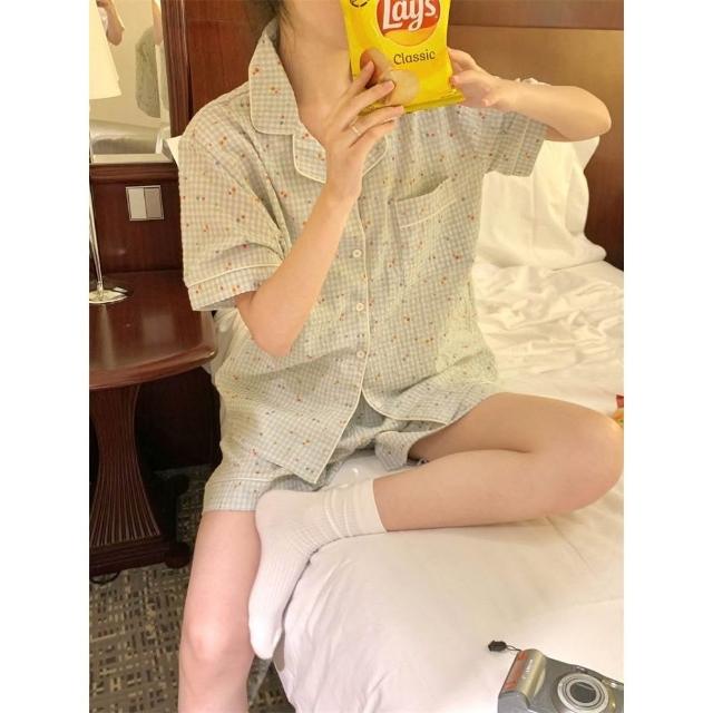 韓版ins碎花格子睡衣女夏季簡約短袖短褲網紅學生寬鬆家居服套裝