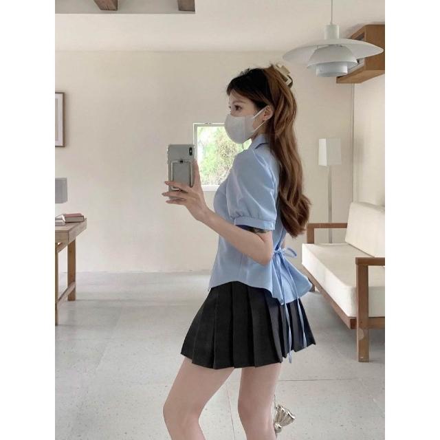 收腰設計學院風翻領泡泡袖繫帶襯衫女夏季高腰半身裙百褶裙兩件套