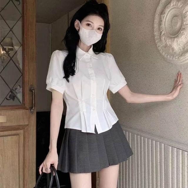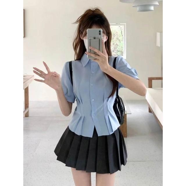 藍色短袖襯衫女夏新款設計感小衆學院風jk小個子顯瘦收腰襯衣上衣