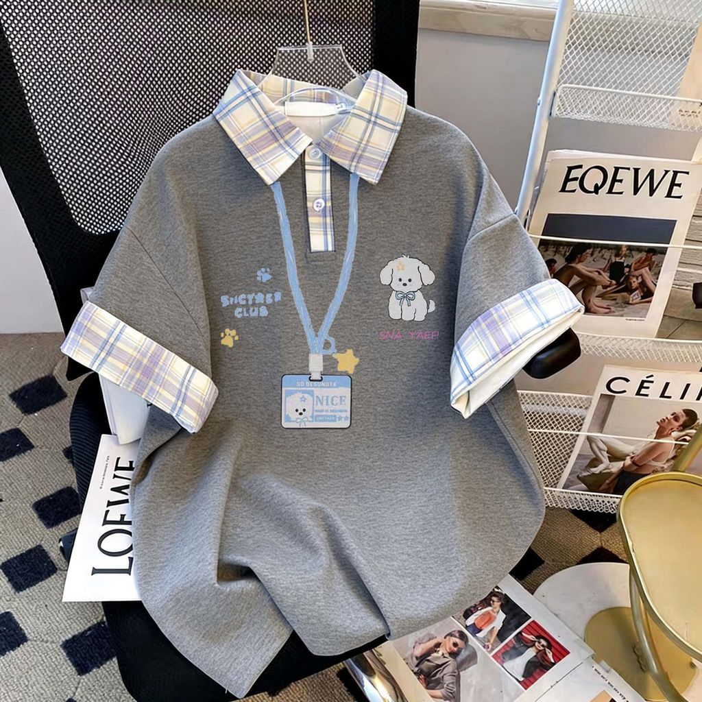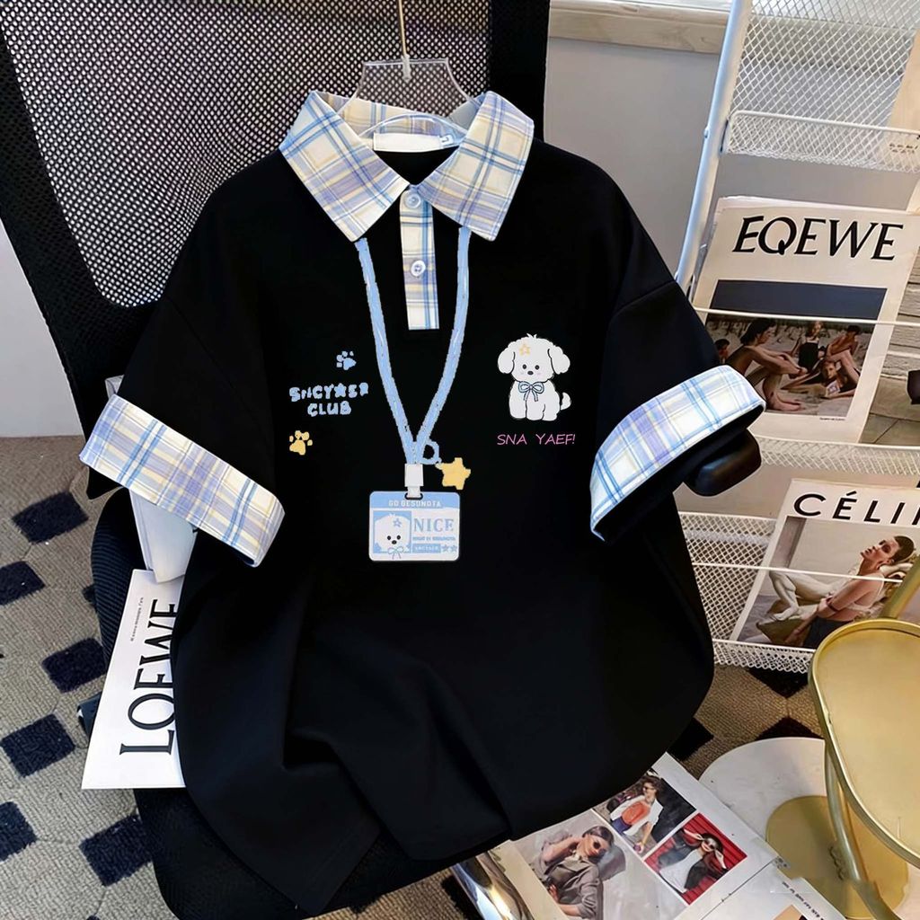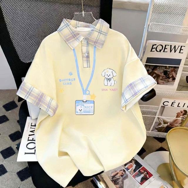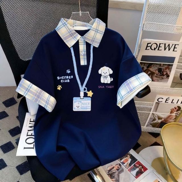 2026新款格子拼接Polo衫女卡通小狗印花寬鬆百搭短袖T恤上衣