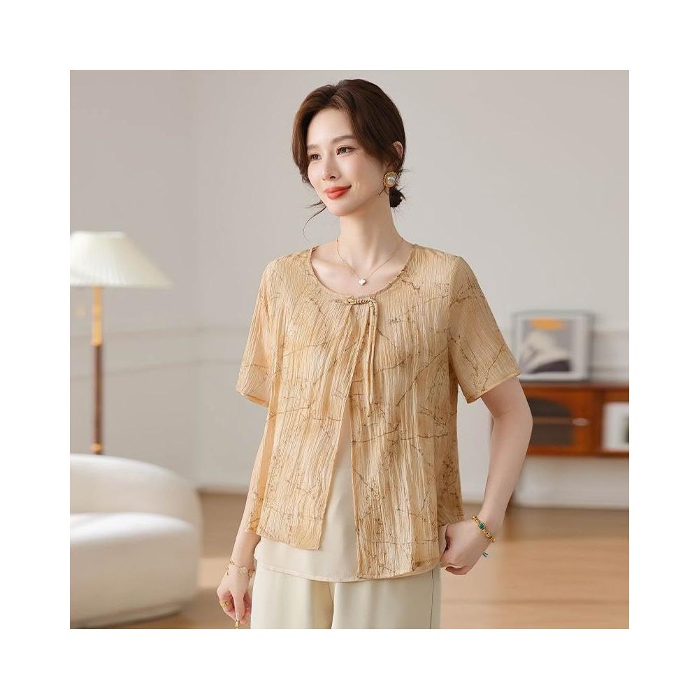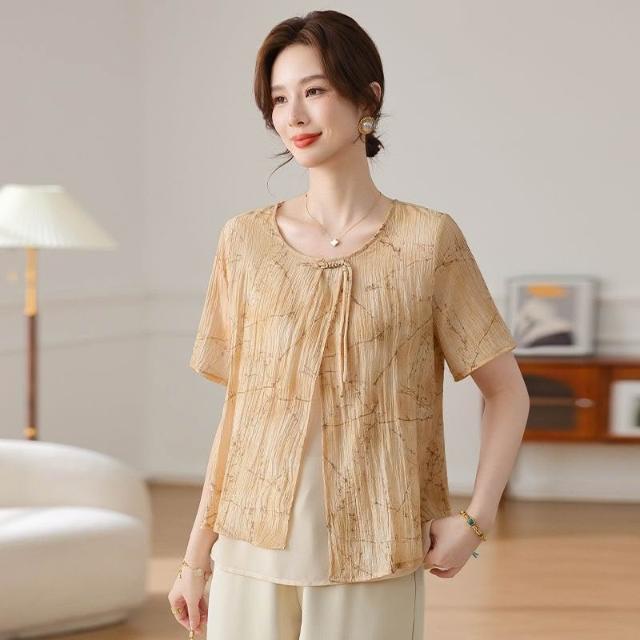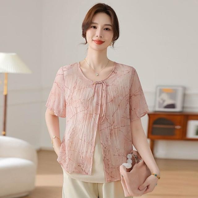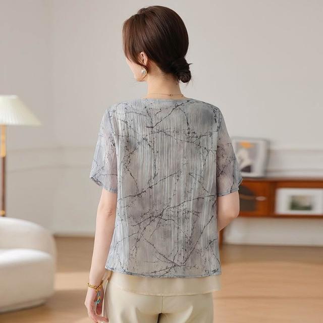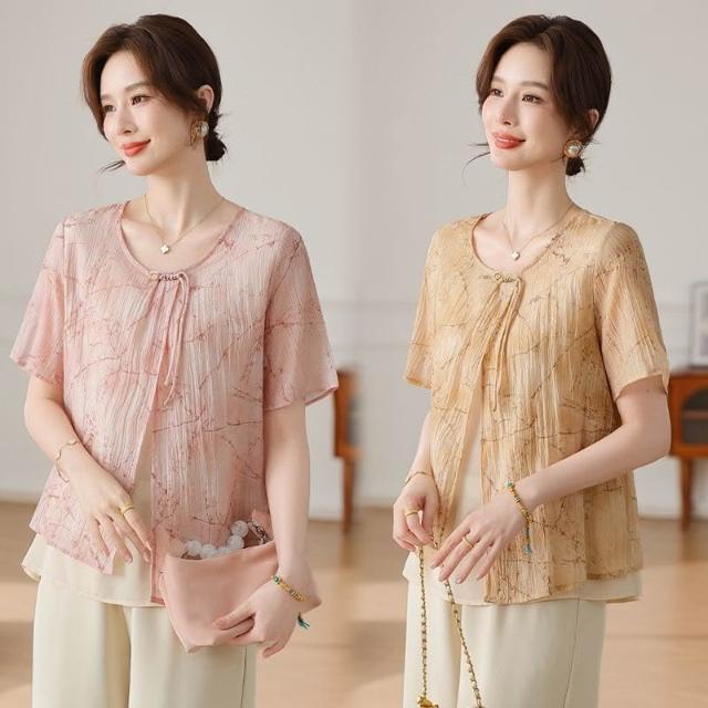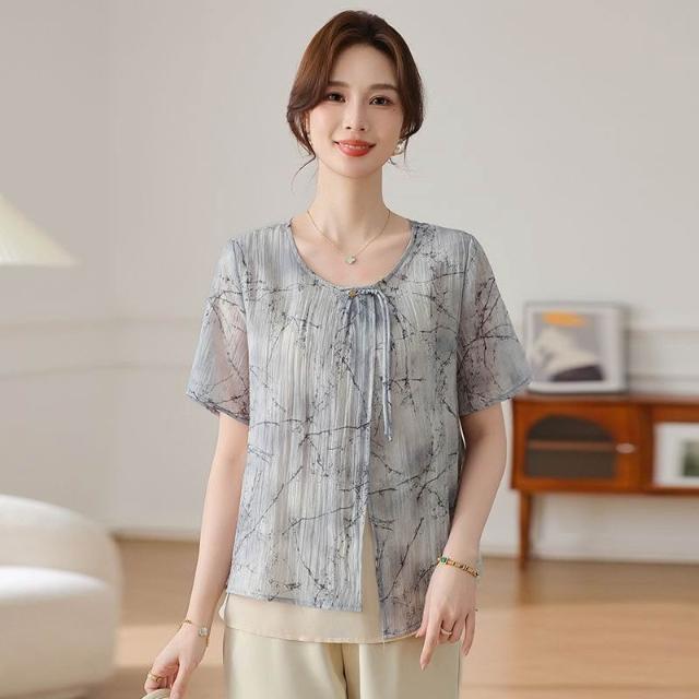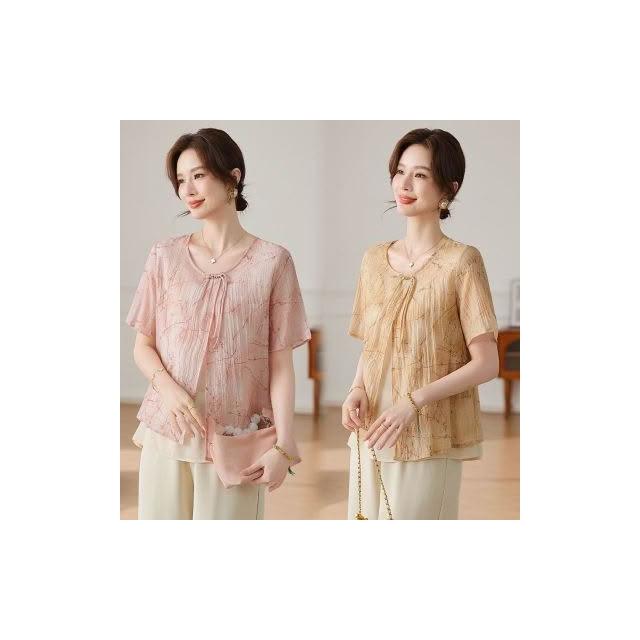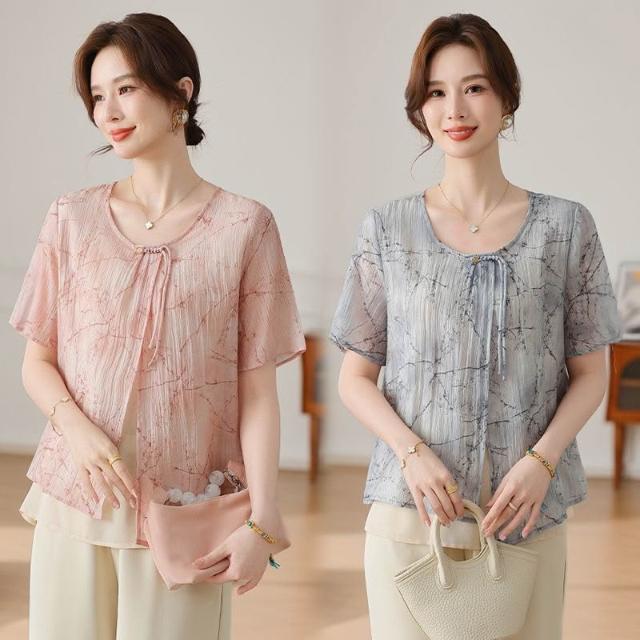 氣質中年媽媽裝雪紡衫時尚遮肚子中老年女裝薄款遮肚子假兩件小衫