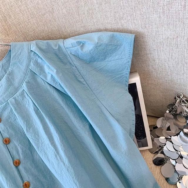 法式藍色短袖襯衫女夏季薄款寬鬆顯瘦洋氣減齡小飛飛袖娃娃衫上衣