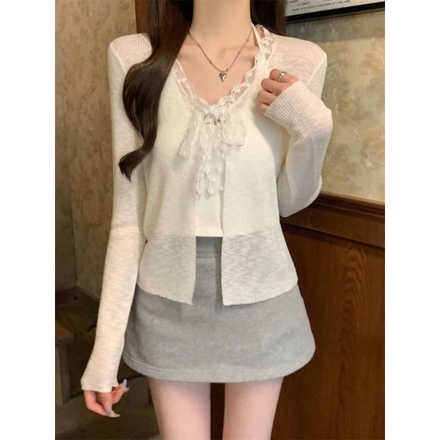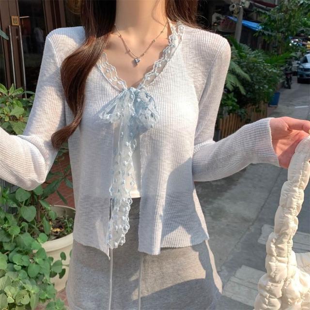 短款V領長袖小外套女夏季2026新款甜美拼接蕾絲綁帶薄款開衫