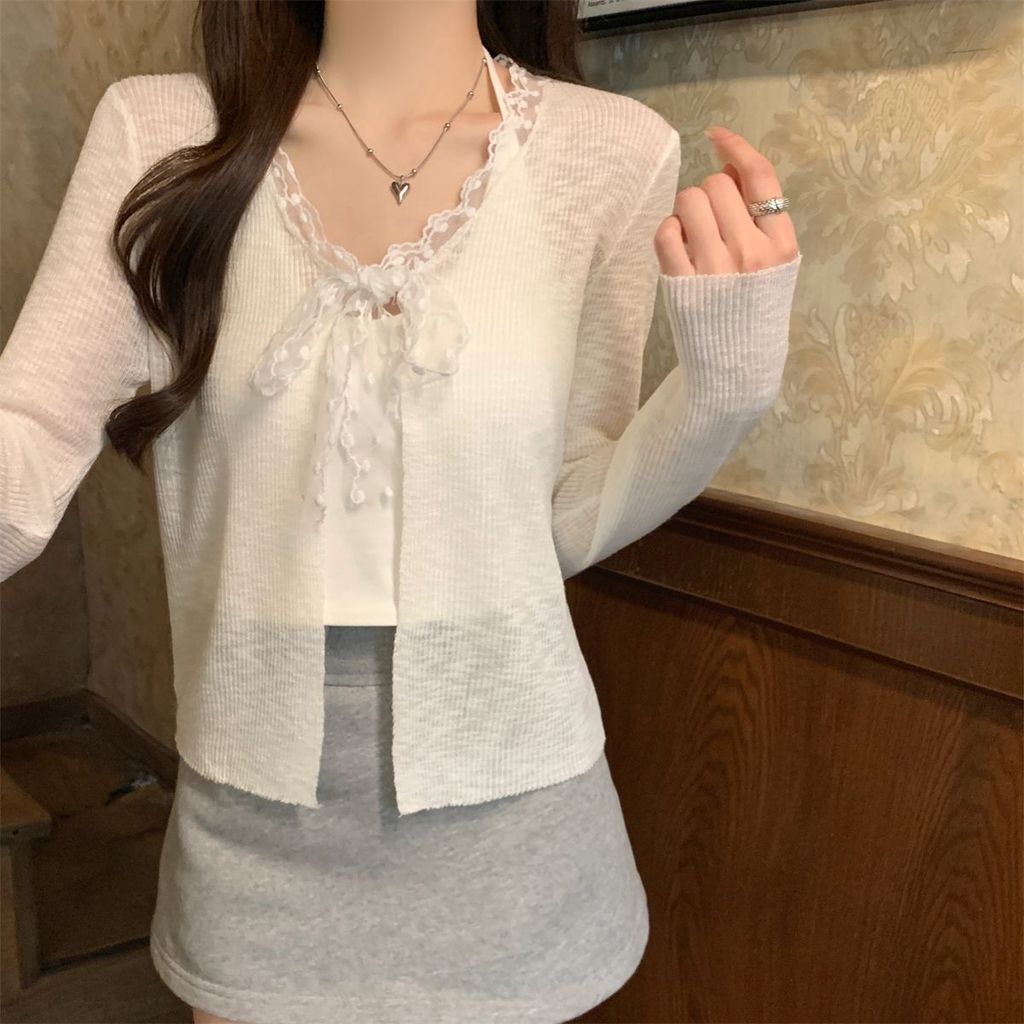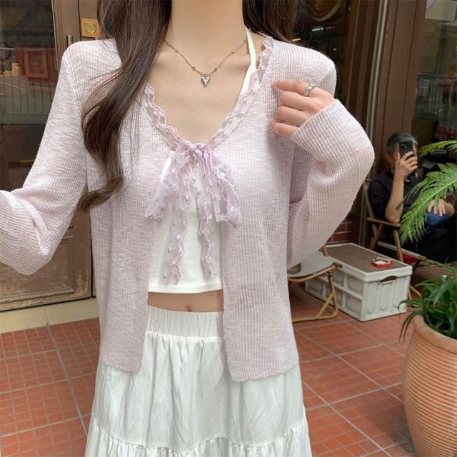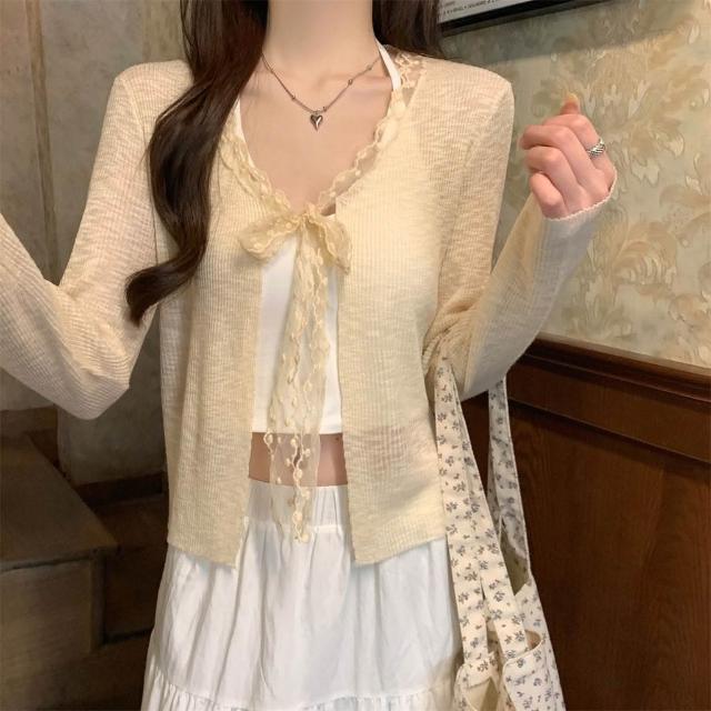 短款V領長袖小外套女夏季2026新款甜美拼接蕾絲綁帶薄款開衫