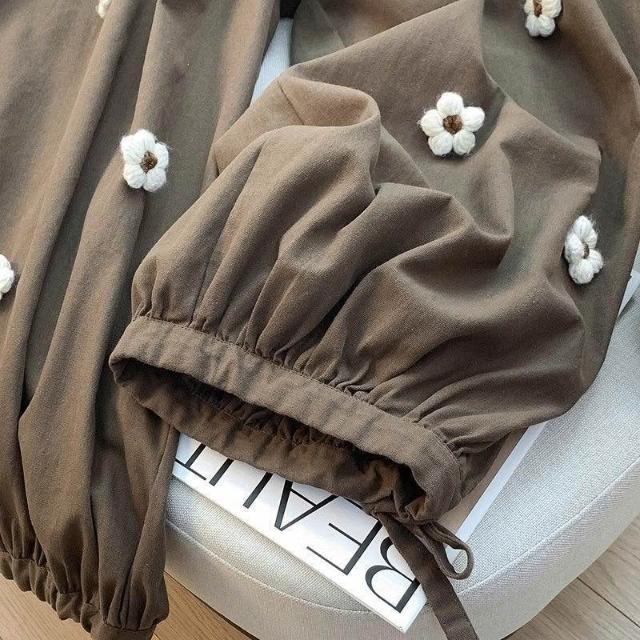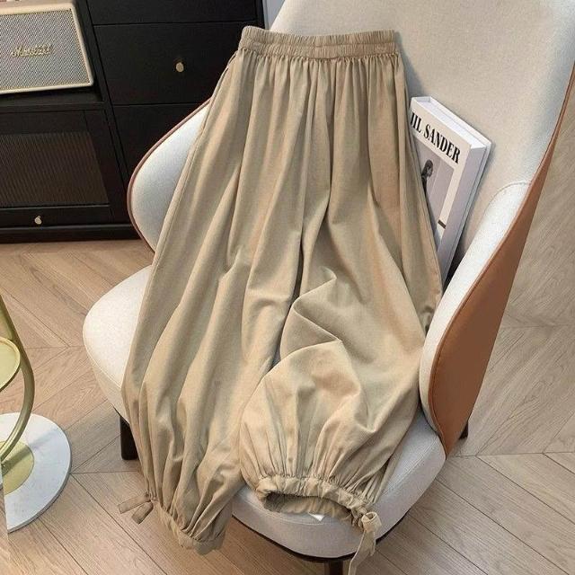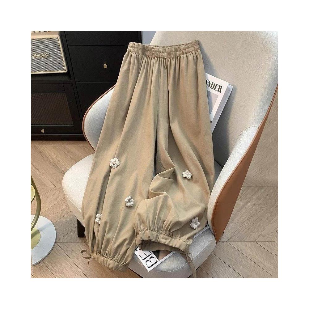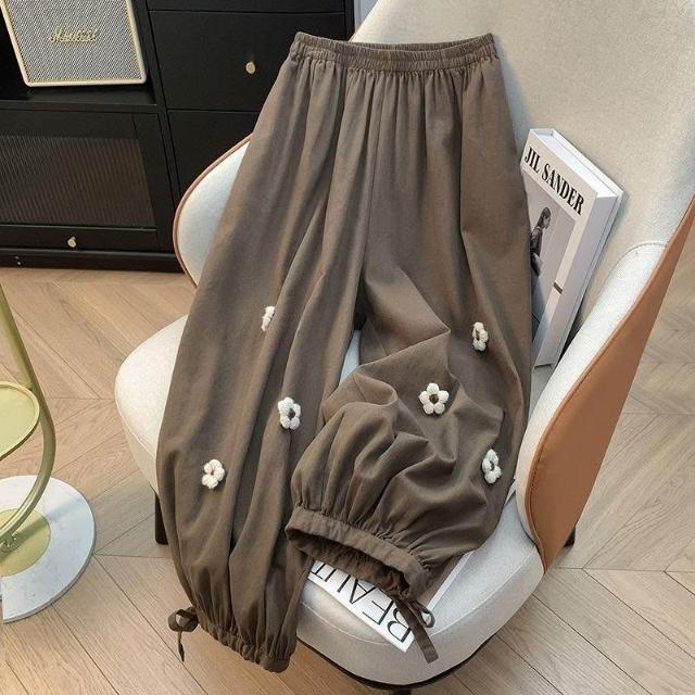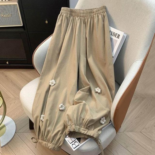 夏秋新款大碼300斤立體花朵燈籠褲高腰遮胯褲口綁帶九分哈倫褲子