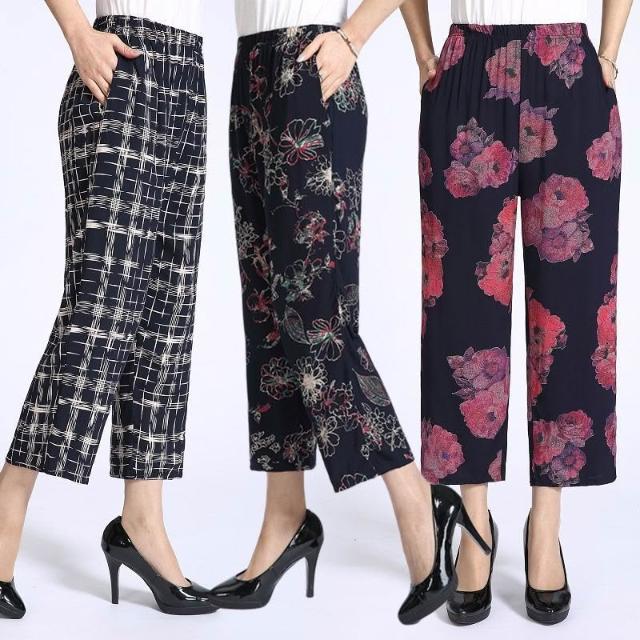 中老年女褲子夏薄款綿綢九分褲鬆緊腰休閒直筒八分褲人造棉媽媽褲