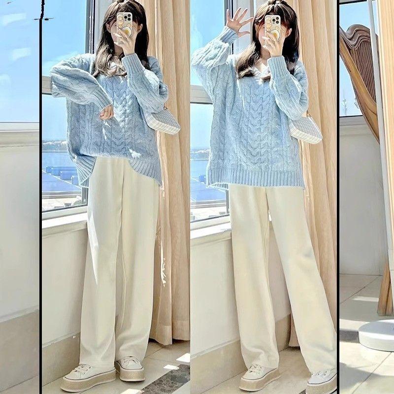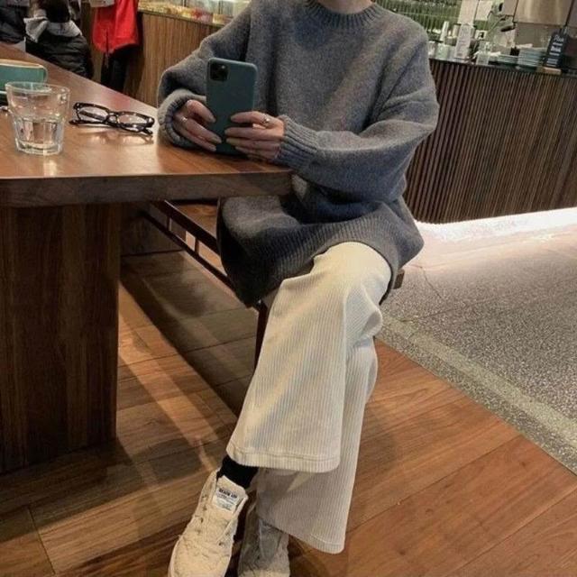 米白色燈芯絨闊腿褲女春秋冬加絨款垂感高腰加絨直筒寬鬆百搭長褲