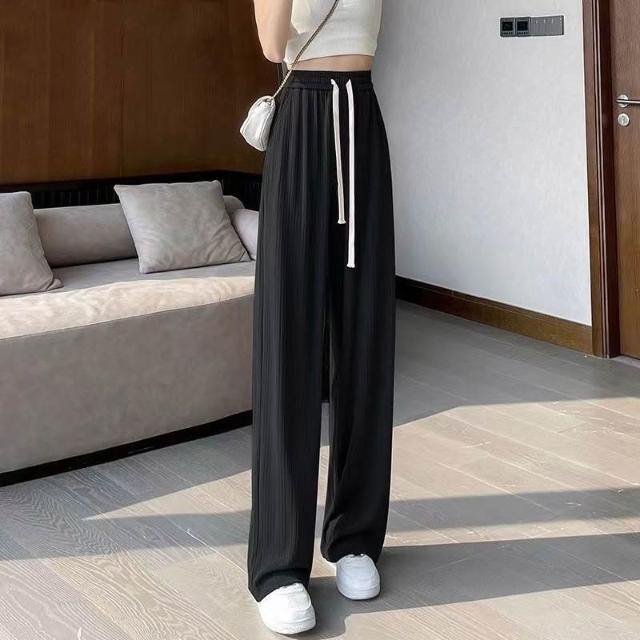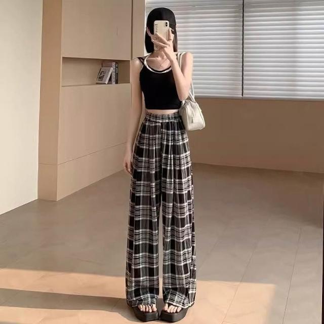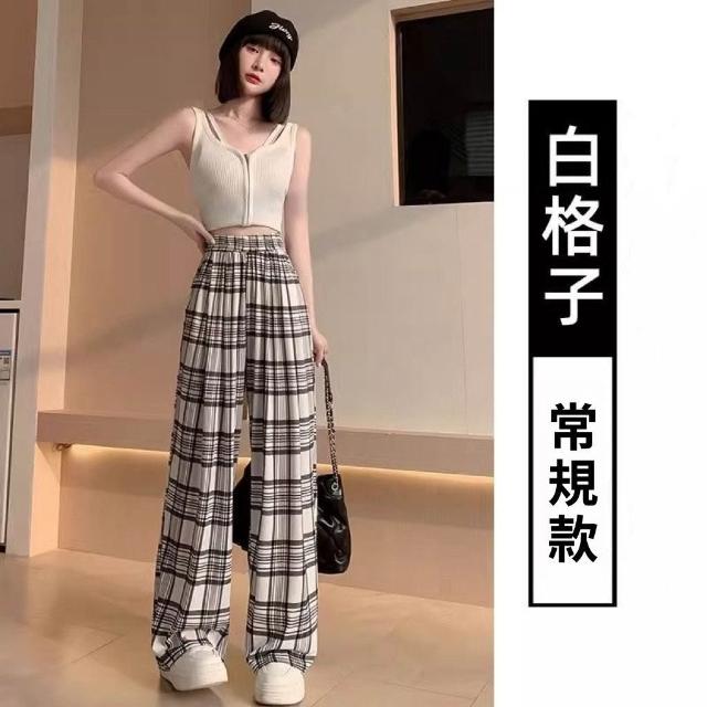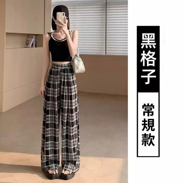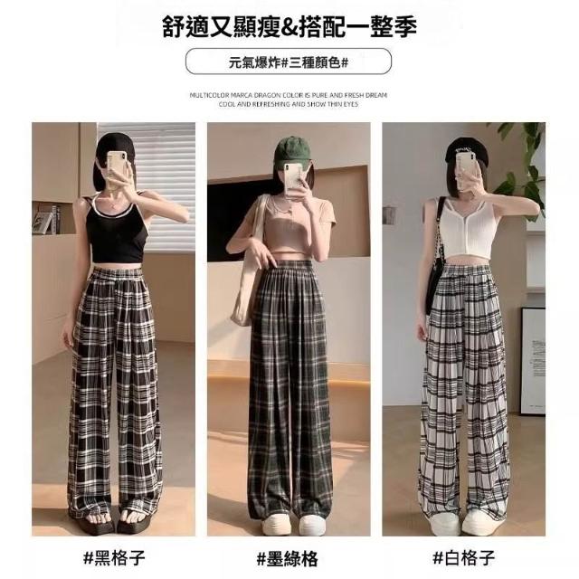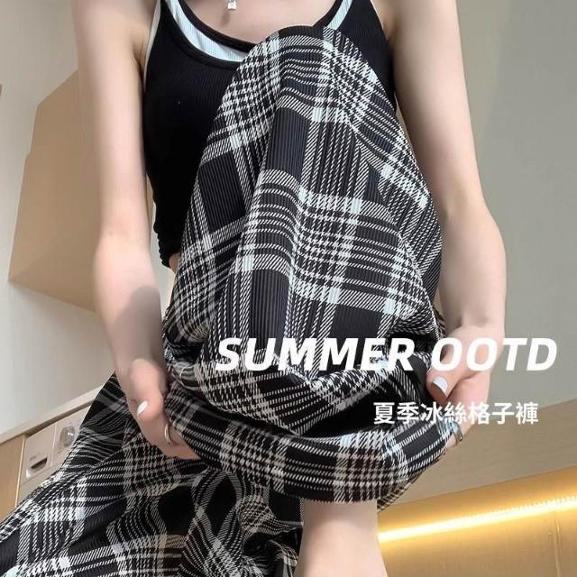 大碼冰絲格子闊腿褲女夏季薄款運動褲子女胖mm寬鬆顯瘦垂感直筒褲