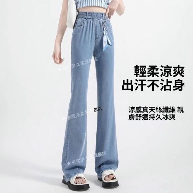 微喇褲天絲牛仔褲女2026年夏季薄款高腰鬆緊腰顯瘦窄版冰絲喇叭褲