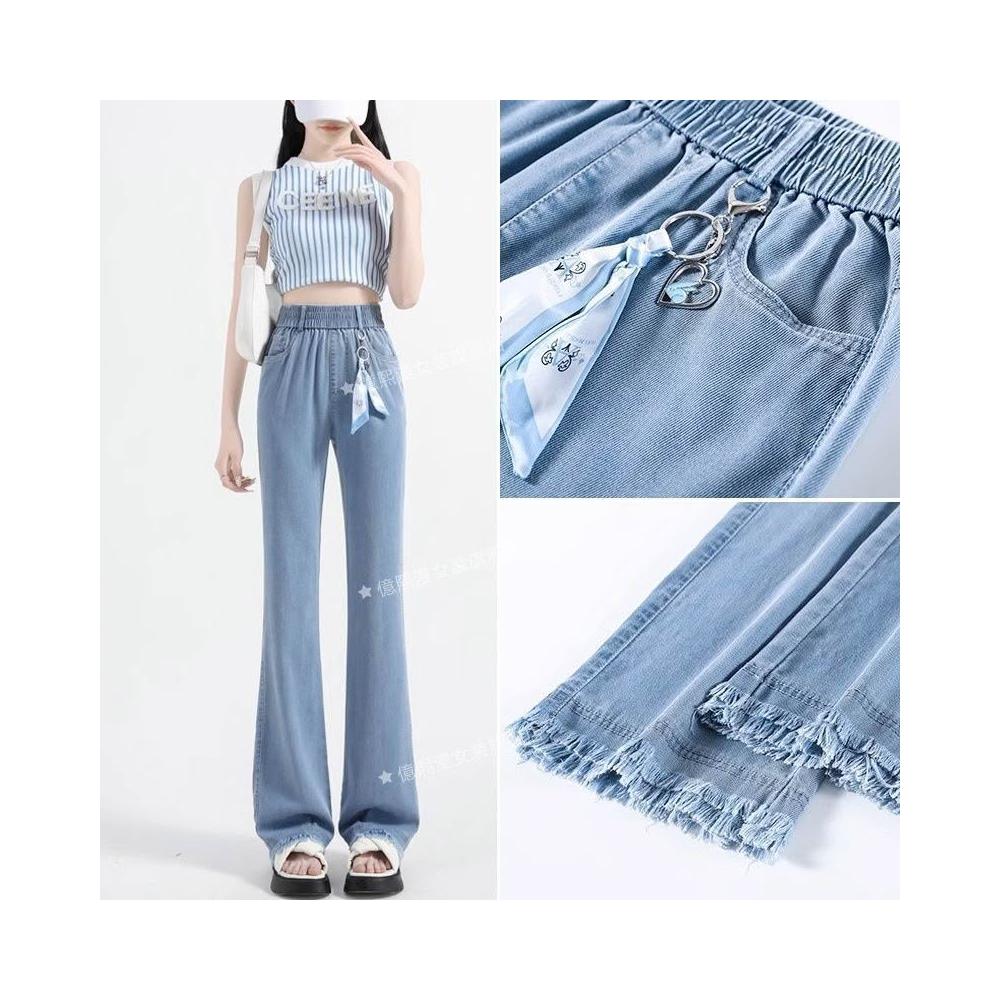 微喇褲天絲牛仔褲女2026年夏季薄款高腰鬆緊腰顯瘦窄版冰絲喇叭褲