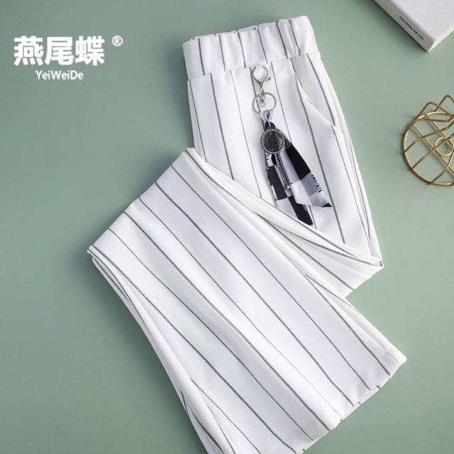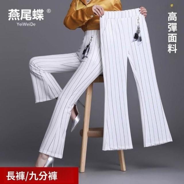 九分/長褲夏款條紋新品喇叭褲白色高彈高腰墜感大碼直筒褲