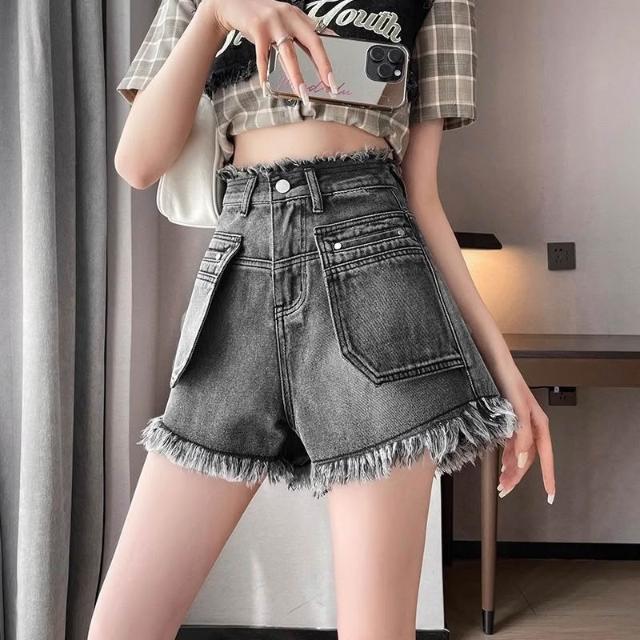 黑灰色牛仔短褲女2026春夏高腰流蘇毛邊寬鬆闊腿a字小個子熱褲子