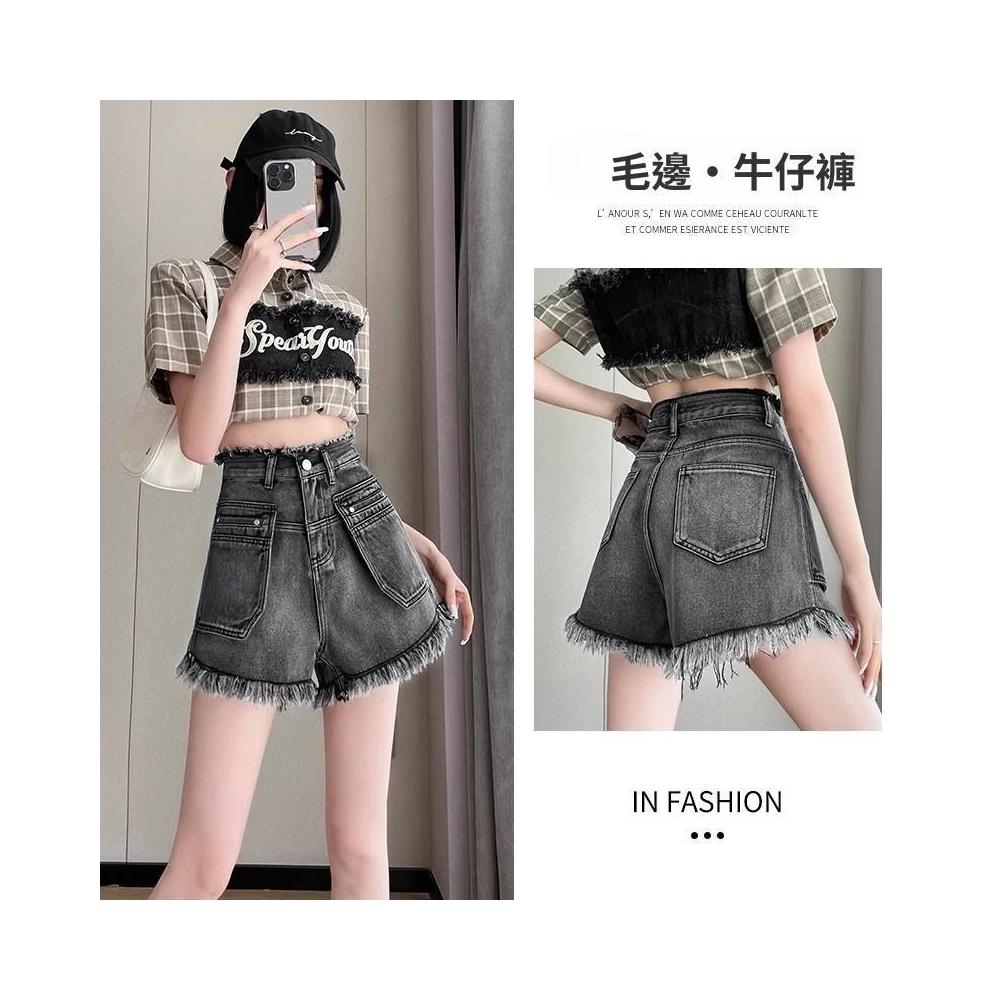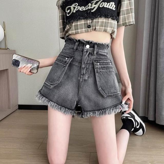 黑灰色牛仔短褲女2026春夏高腰流蘇毛邊寬鬆闊腿a字小個子熱褲子