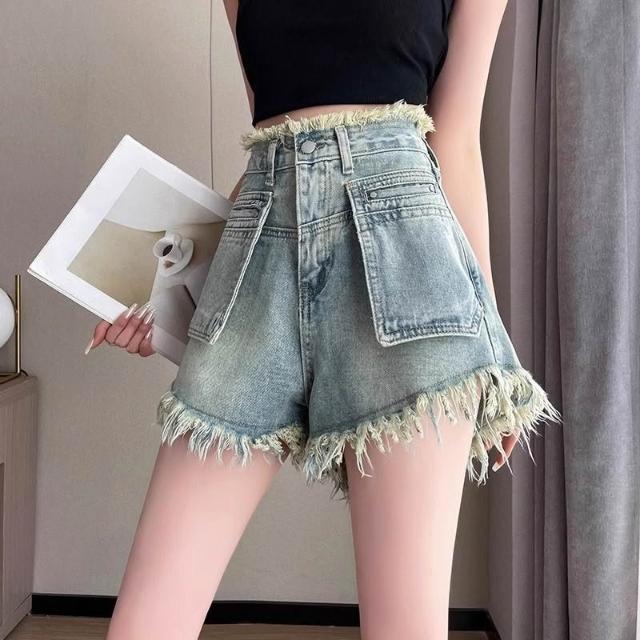 黑灰色牛仔短褲女2026春夏高腰流蘇毛邊寬鬆闊腿a字小個子熱褲子