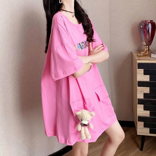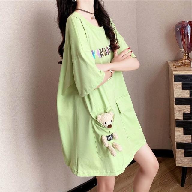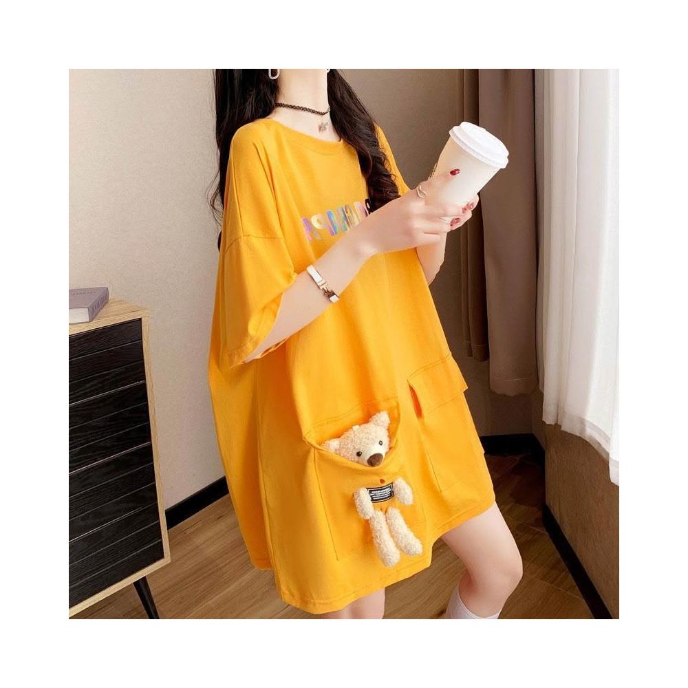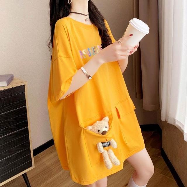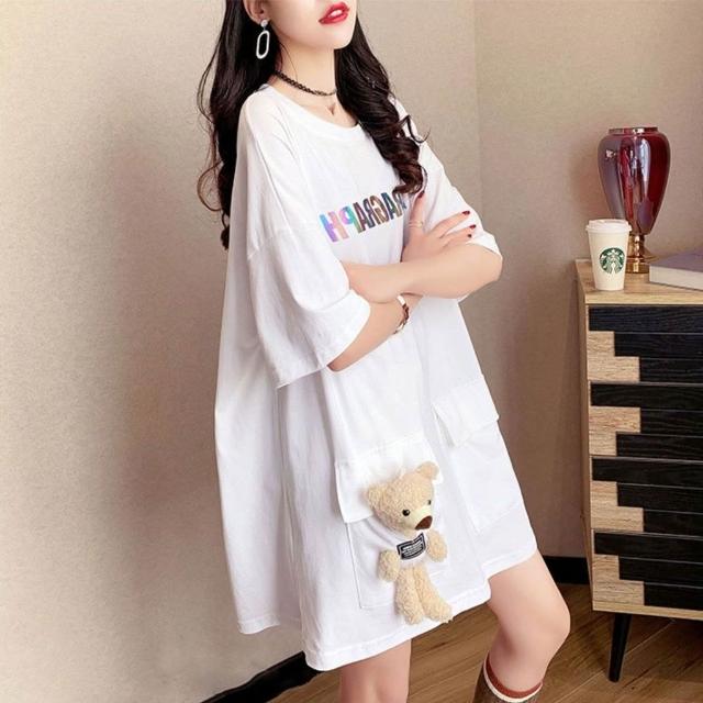 夏季新款大碼中長款短袖t恤女胖mm寬鬆顯瘦口袋小熊減齡洋氣上衣