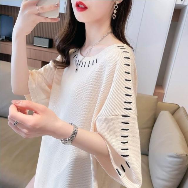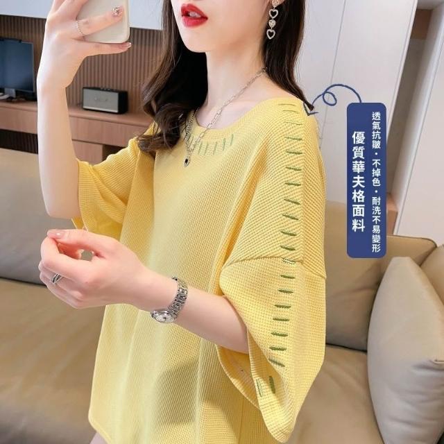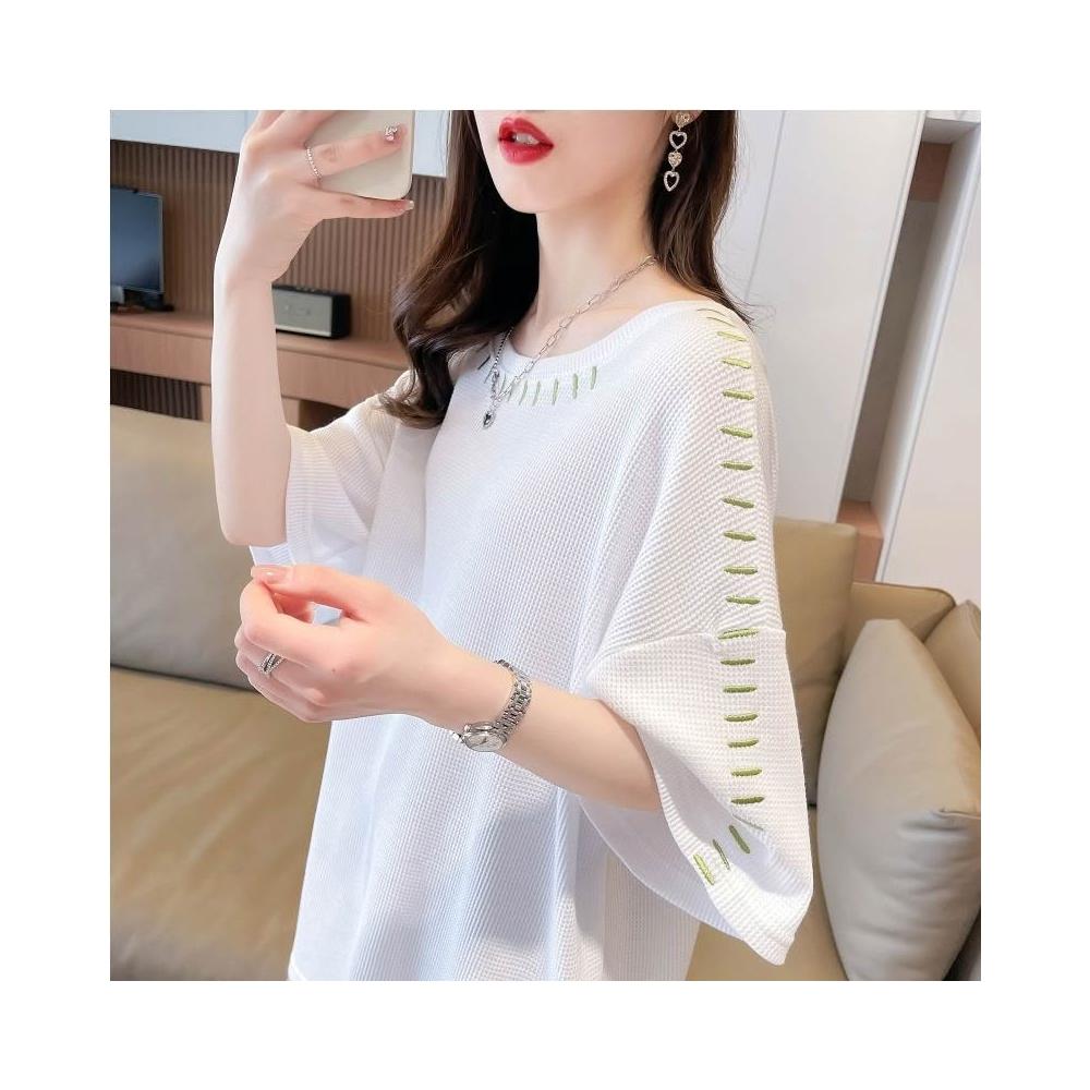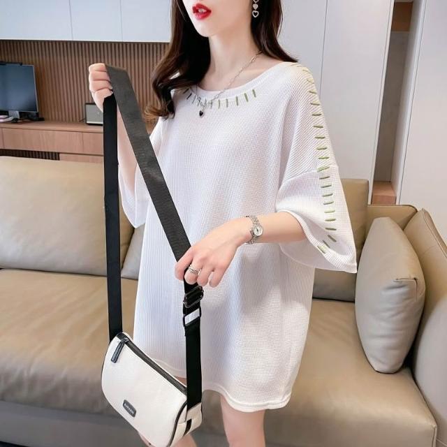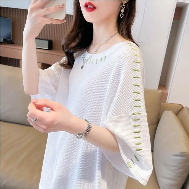 華夫格白色t恤短袖ins潮女韓版寬鬆大碼女裝中長款刺繡夏季上衣服