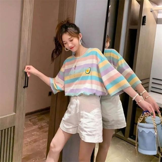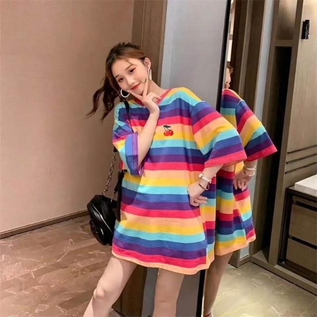 ins新款條紋夏季短袖t恤女刺繡彩虹寬鬆中長款韓版多巴胺休閒上衣