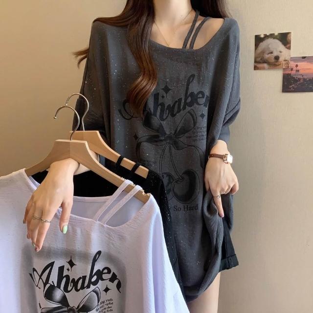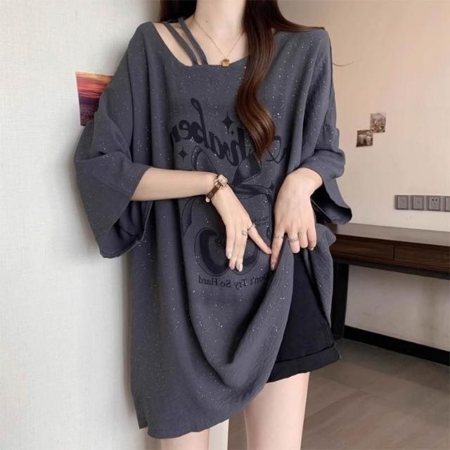 胖mm法式亮片短袖T恤大碼女裝夏季顯瘦中長款寬鬆遮屁股上衣300斤