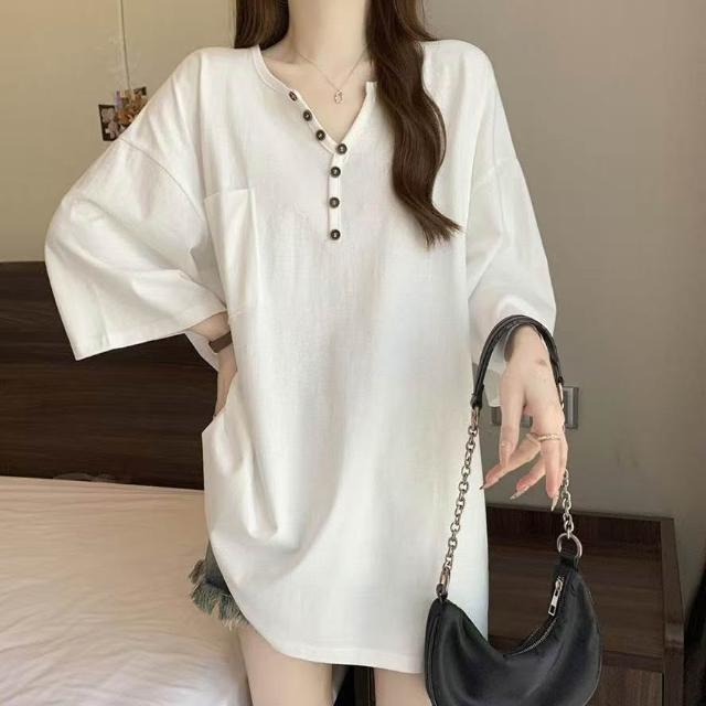 中長款v領短袖t恤女夏季大碼胖mm遮屁股2-300斤洋氣遮肉顯瘦上衣