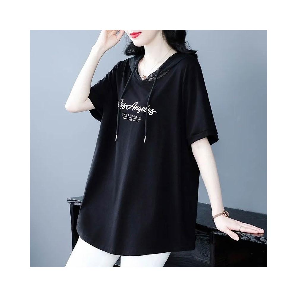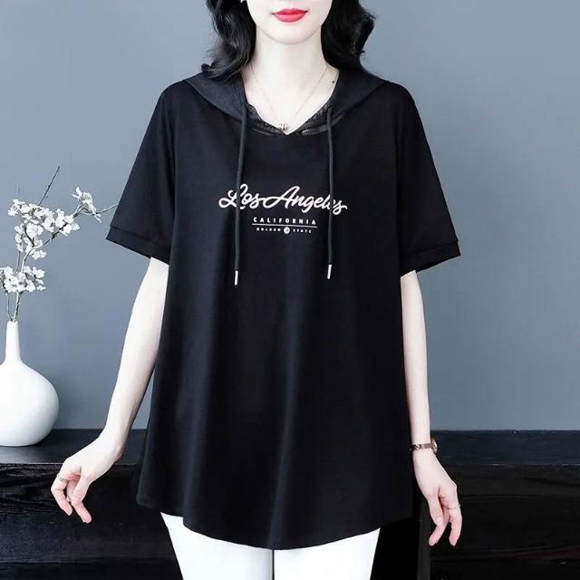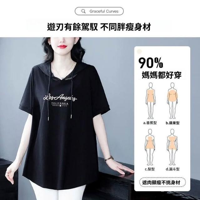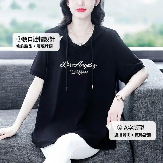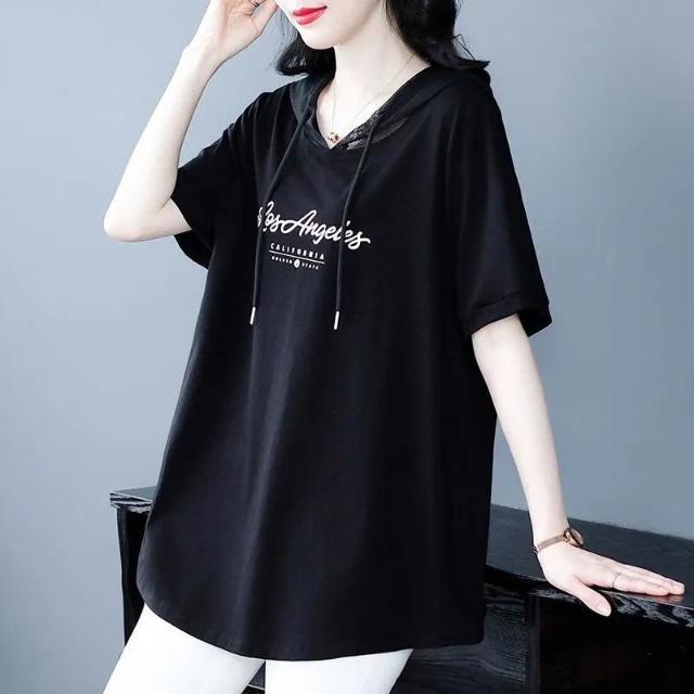 大碼女裝短袖T恤夏季新款韓版遮肚顯瘦通勤印花連帽寬鬆洋氣上衣