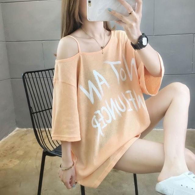 一字肩露肩吊帶藍色T恤女短袖寬鬆大碼斜肩上衣女胖mm夏季中長款