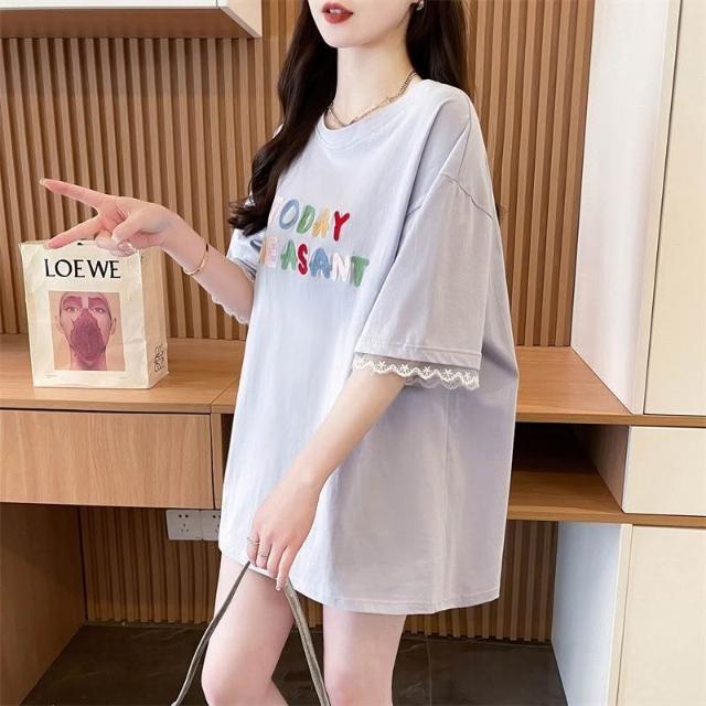 刺繡蕾絲拼接短袖t恤女2026新款夏季中長款寬鬆大碼胖mm純棉上衣