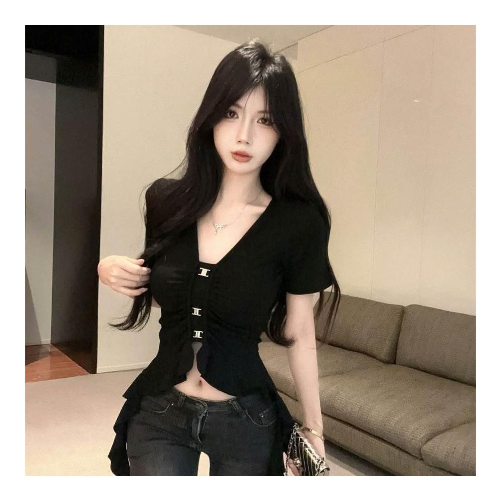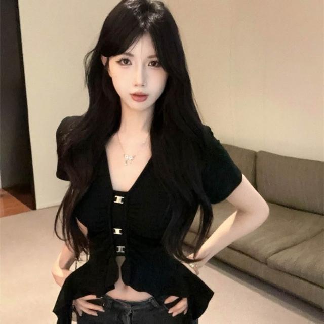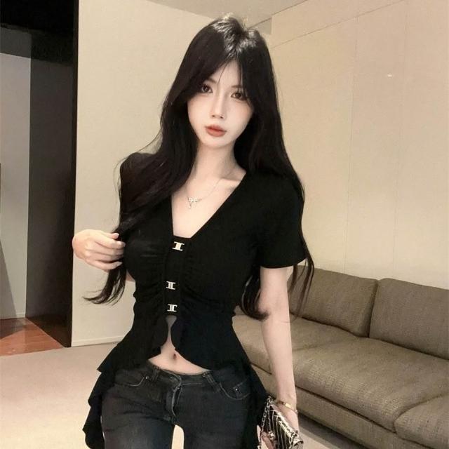 多巴胺辣妹性感新款金屬短袖不規則修身顯瘦設計氣質百搭T恤上衣