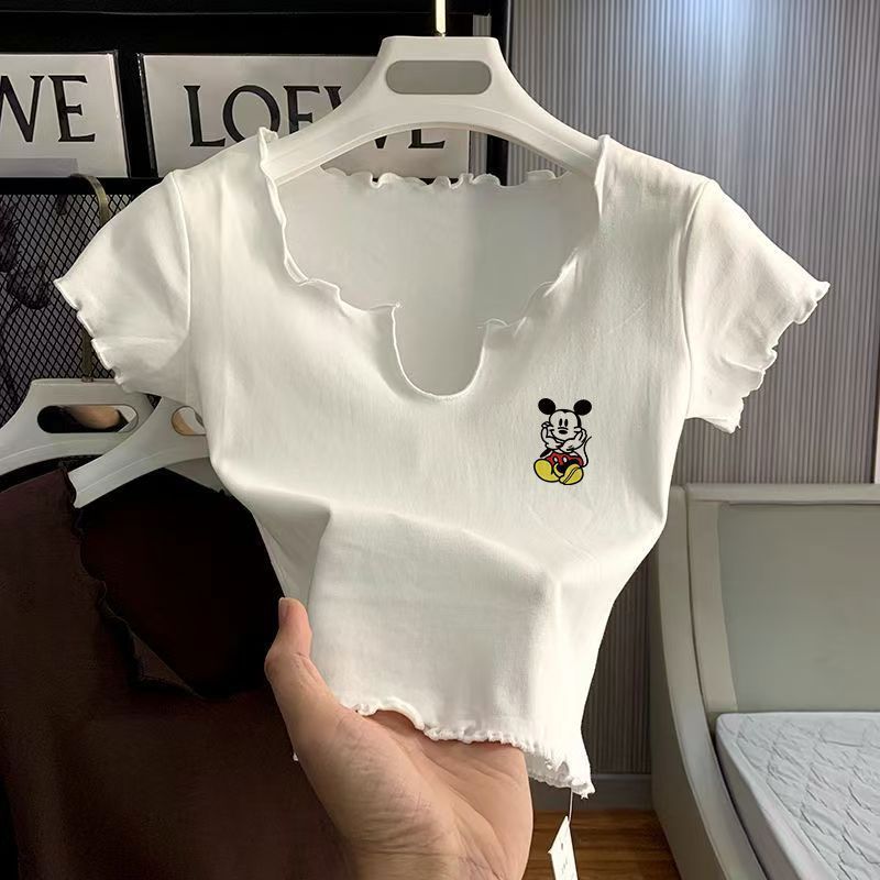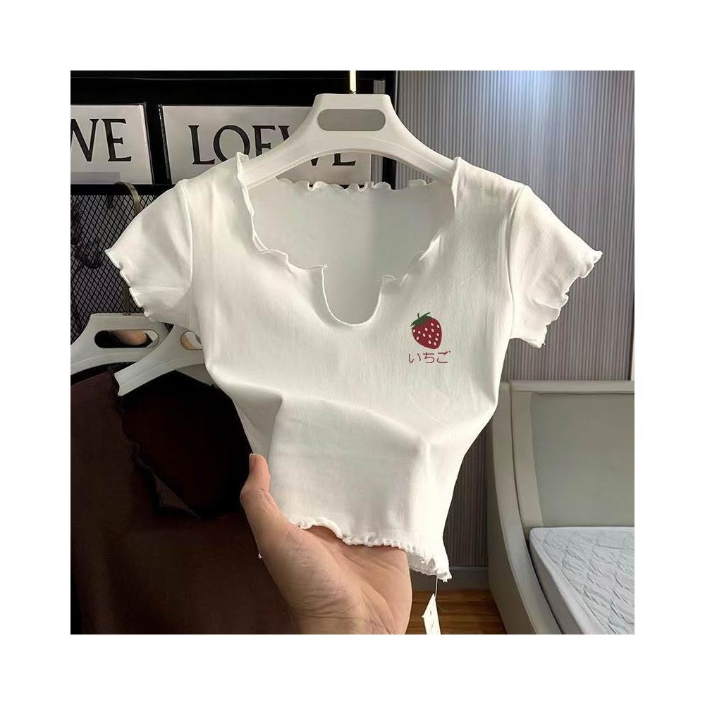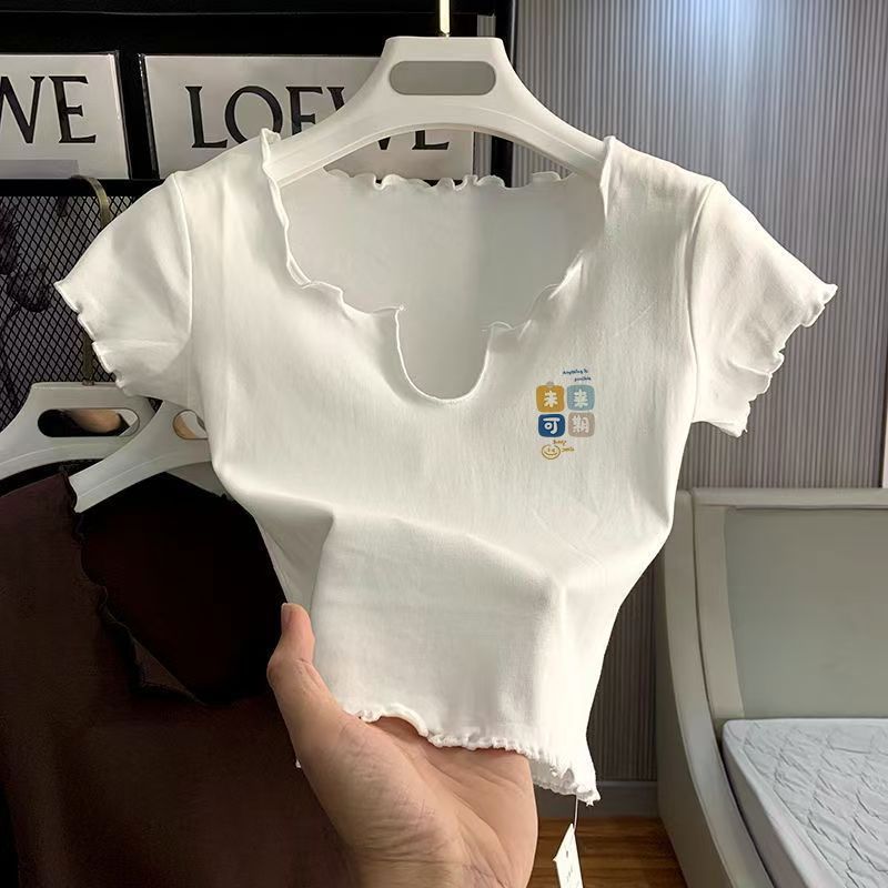 小v領鎖骨上衣女夏季短袖短款修身顯瘦白色辣妹裝木耳邊T恤正肩