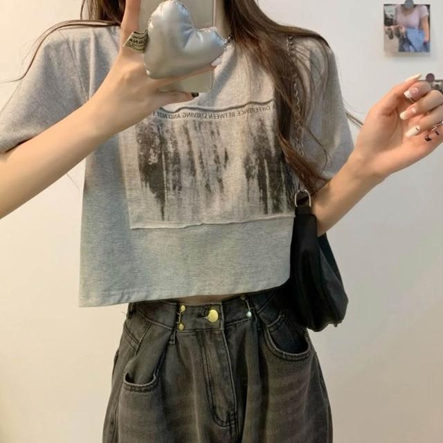 2026夏季新款韓版字母印花圓領墊肩短袖T恤女設計感小衆寬鬆上衣