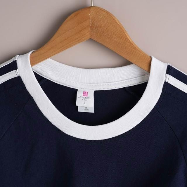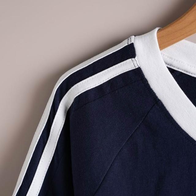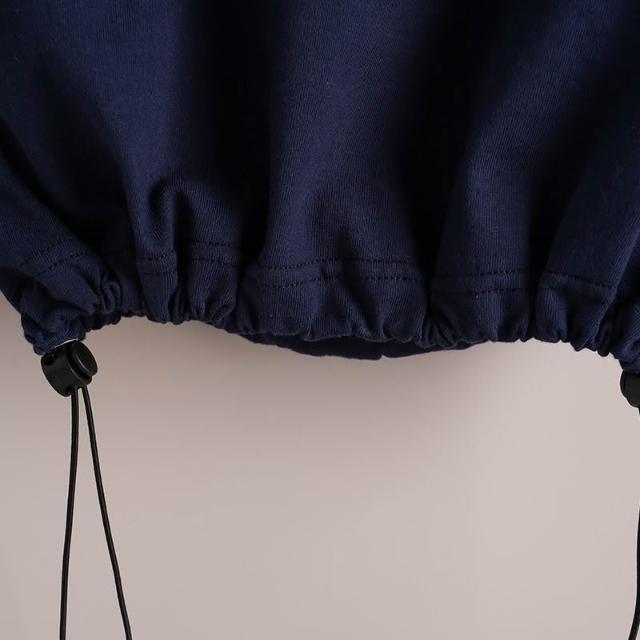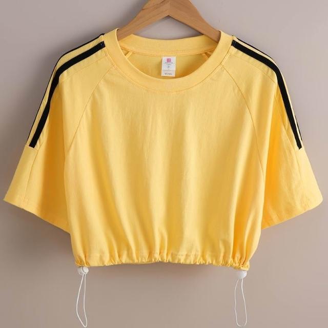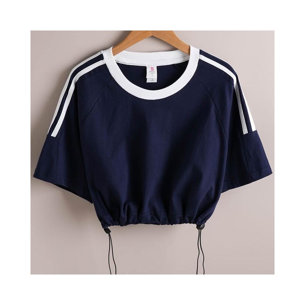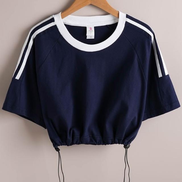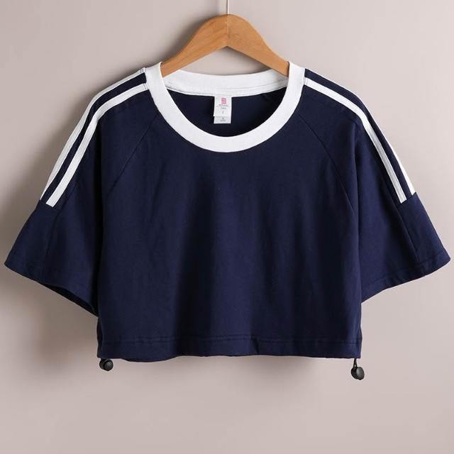 藏藍色條紋短袖T恤女運動風罩衫爵士跳舞上衣穿搭高腰露肚臍ins潮