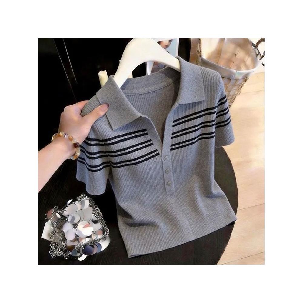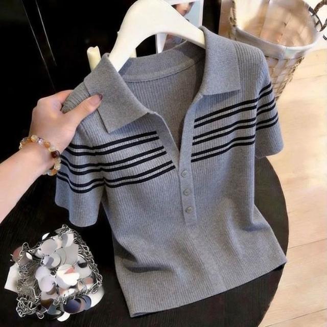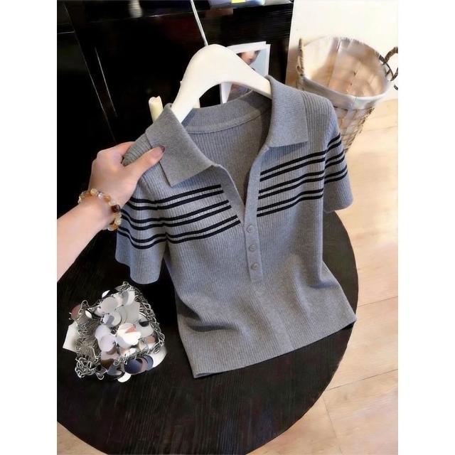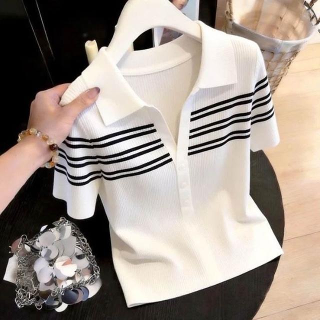 夏季新款條紋polo領短袖t恤女寬鬆大碼遮肉顯瘦洋氣上衣針織衫