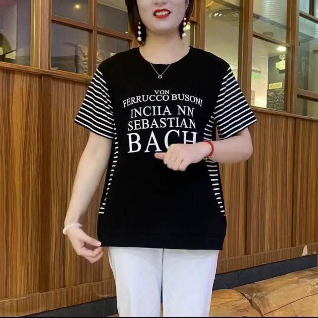 短袖T恤大碼女媽媽裝條紋字母顯瘦新款寬鬆遮肚短袖夏季洋氣上衣