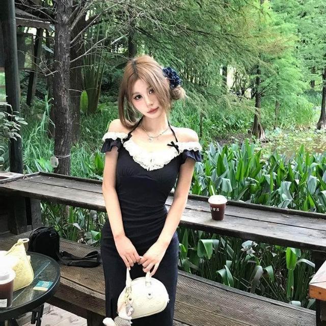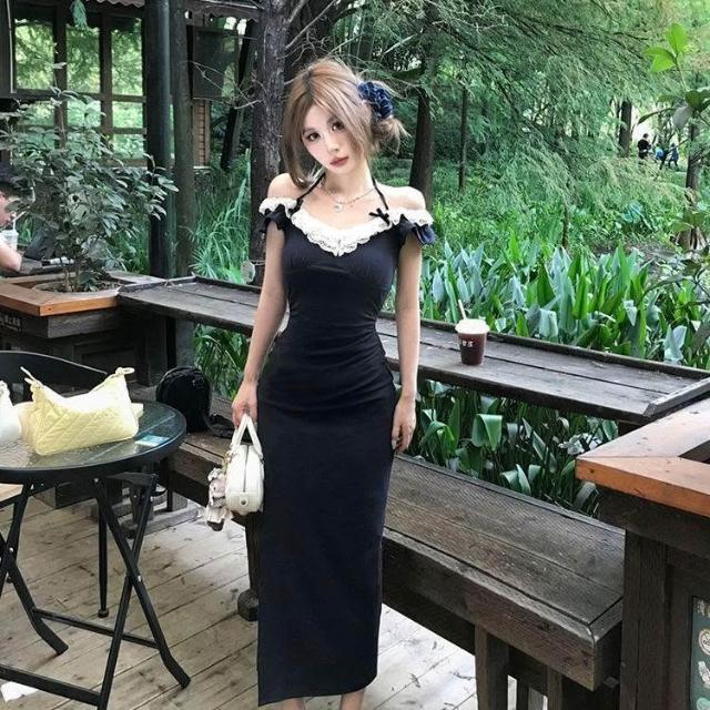 2026新款純欲辣妹小香風蕾絲拼接掛脖長裙蝴蝶結性感穿搭夏天裙子