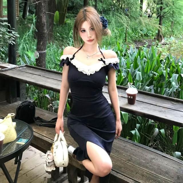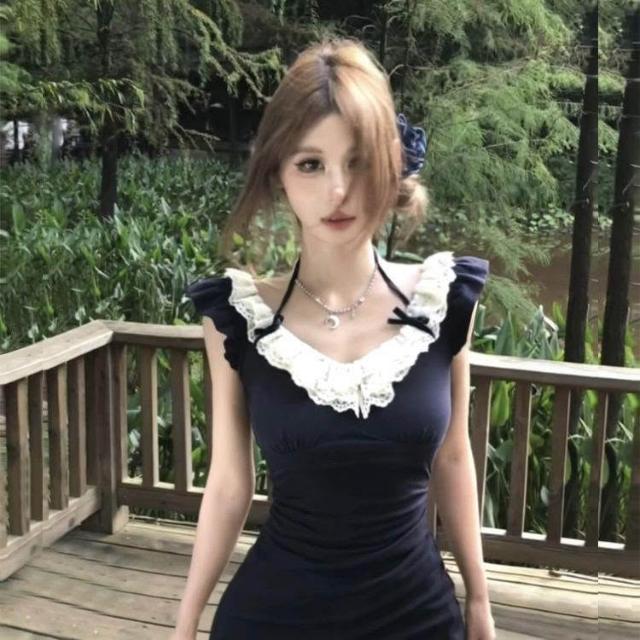 2026新款純欲辣妹小香風蕾絲拼接掛脖長裙蝴蝶結性感穿搭夏天裙子