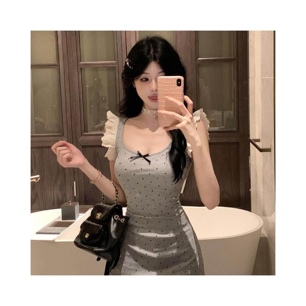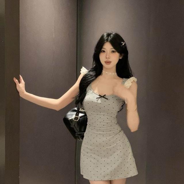 純欲風辣妹蝴蝶結波點印花花邊連衣裙小個子夏季蕾絲收腰夏天裙子